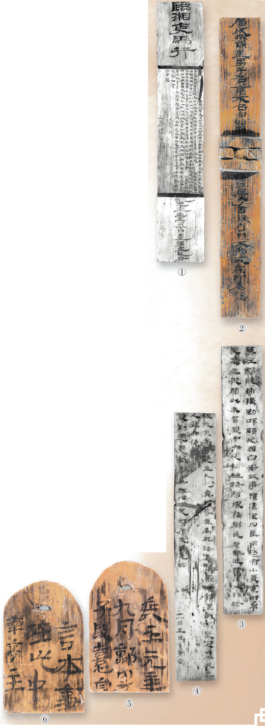图⑤:“本事”签牌的正面。签牌上端的圆孔用以穿绳,可系于成卷的册书之上。其上所书文字用以显示卷宗的主要内容。
