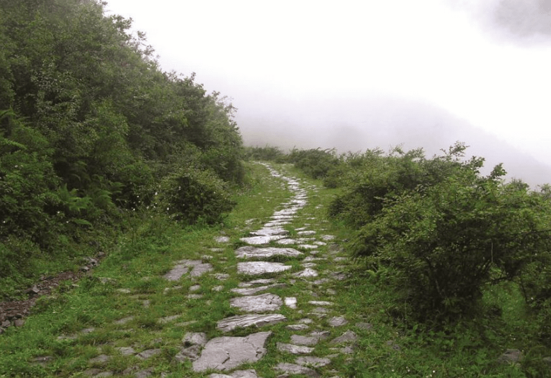 这是一段保存完整的古道,由于地势偏僻,又在山上,并未经受太大的破坏。沿着古人的脚步走上一段,看着这些踩得光溜的石板,脑海中不由得浮现出一些场景:山路崎岖,背夫们弯着腰,脚上的草鞋一步一步印在或宽或窄的小道上,背上整整齐齐的茶包像山一样高过头顶。也许是刚刚东踅西倒地走过一段悬崖峭壁,要下坡了,把一根丁字形“拐筢子”撑在茶包底下歇一口气。路远无轻担,这样的简单小憩不知经过多少次。天长日久,路面的石板上,居然磨出了大大小小的坑,那是岁月的印痕。由于太过艰险,他们每天只能行走二三十里路。