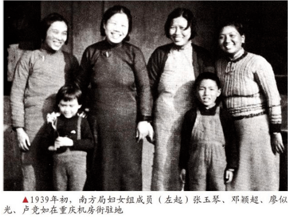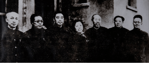 吴玉章、陆定一、周恩来、邓颖超、董必武、王若飞、秦邦宪(左起)在重庆留影