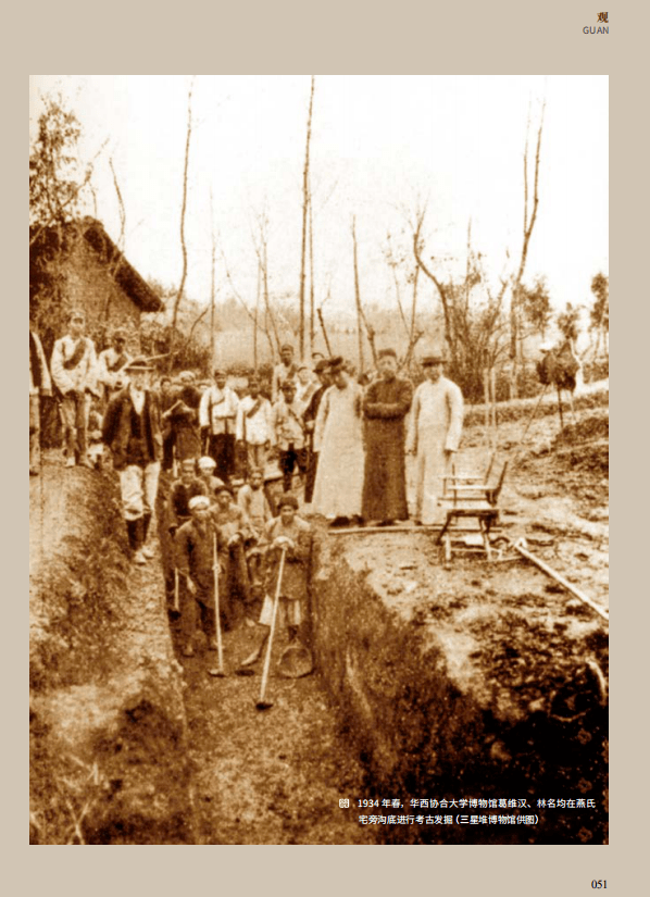 1929年,广汉农民燕道诚、燕青保父子在三星堆月亮湾台地燕家院子门前掏沟时发现一坑约400件精美的玉石器 ,一时间,“广汉玉器”声名鹊起。1934年,华西协合大学博物馆在馆长葛维汉(David Crockett Graham)和副馆长林名均带领下,在1929年燕家院子玉石器坑地点附近进行三星堆历史上的首次考古发掘,出土、采集600余件玉石器和陶器标本,从而拉开持续90余年的三星堆考古的序幕。