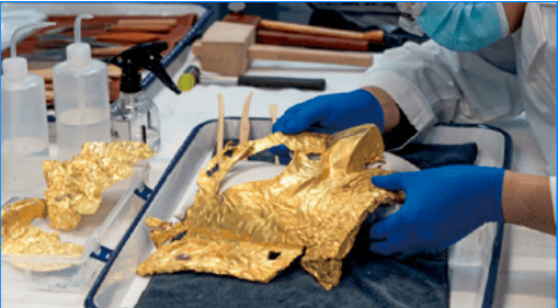 三星堆遗址黄金面具清理保护(图片来源:三星堆博物馆)