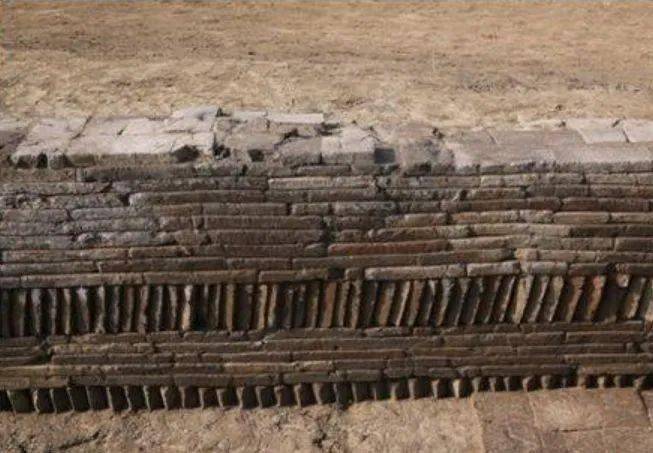 该晚唐时期城墙两侧均为砖墙,残高约1. 5米,用砖规格不一,包砖的砌法是先挖基槽,在槽内筑一层夯土,再在夯土上铺一层泥夹卵石,其上再砌包砖。