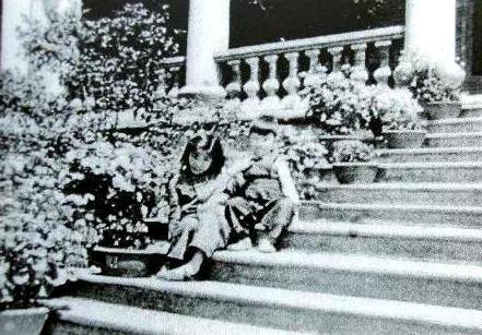 作者蔡玲与弟弟和平在别墅大门的石阶上玩耍,背后是别墅一层宽敞的避雨走廊(左图);蔡长风与女儿蔡玲儿子和平合影(右图)