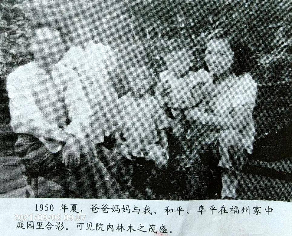 院外有一片很大的鱼塘,1951年,父亲抱着2岁的阜平,母亲牵着8岁的我和5岁的和平,在这鱼塘边照了一张相。福州经常刮台风发洪水,当时一发大水,一片汪洋,分不清哪儿是鱼塘哪儿是地面,有时行人一不小心跌入鱼塘淹死。只要一发大水,门岗叔叔就不放我们出门,我和和平就一人坐一个木盆在院内划“船”玩。水涨船高,很多果子平时够不着,发大水反而能够着了。我俩坐着木盆,以手当浆,漂浮于各种果树林木之间,或伸手采摘树上的鲜果,或低头抓捕水中的游鱼。有一次,和平伸手就摘了一个青桔子,张口就咬,自然是涩得他龇牙咧嘴,放声大哭。我赶忙摘了一个甜的哄他,他马上破涕为笑,泪珠鼻涕还挂在脸蛋上。现在回想起儿时的情景,72年前的往事就在眼前,真是非常的温馨而美丽。