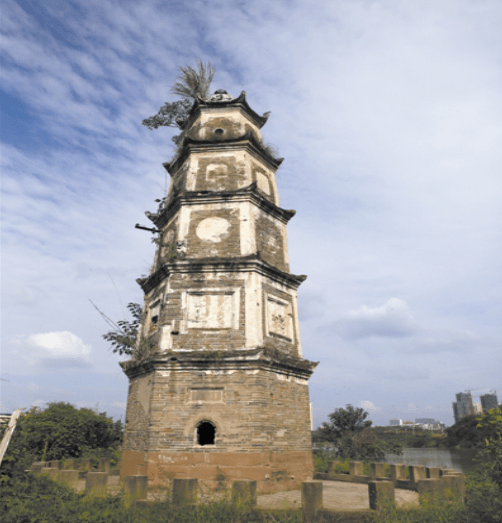 回澜塔周边还修了一些附属建筑:文昌宫、聚星台、醴泉池、望骖亭等。塔周圈以围墙,墙开三道门,有石级台阶联结三方山脚,“梯径亦旋转纡回,登之者有仰之弥高之壮观”。时人为感谢朱公建塔,于天乙峰麓为朱县令建生祠、悬标准像以“祈世世尸祝之,与山灵并不朽”,真可谓一时间荣耀之至。
