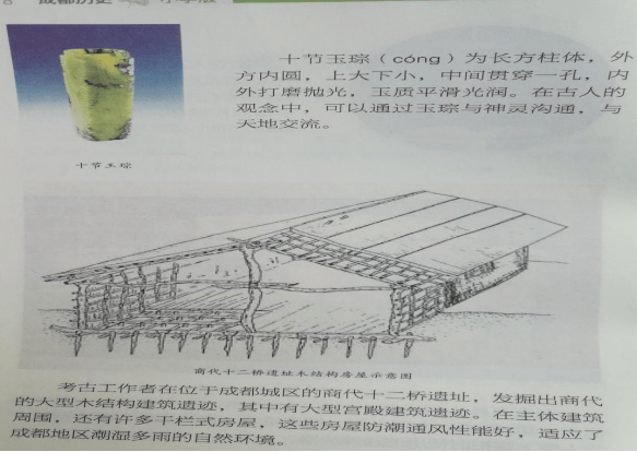 第11页,“秦王下令修筑成都城……”一说,这确实是一个较有争议的话题。一些学者常常把成都的城市历史定格在秦张仪扩建成都城作为城市历史的开始。这与该教材第8页诉及的商代成都十二桥“大型宫殿建筑遗迹”的发现,尤其是第5页“发现大型建筑基址”“祭祀区”等城市特征等,不相一致,也难以解释金沙遗址文明的辉煌,更难以解释更早的成都“羊子山祭祀台”存在等事实。“大型宫殿建筑遗迹”的发现,正可以说明这样一个事实:至少在商代,成都已具有城市的规模。这就与“秦王下令修筑成都城……”的说法形成矛盾。