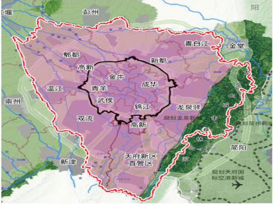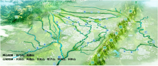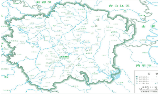 此外还有一个文化学的证据。成都“东山”地区,包括龙泉驿区的十陵、西河、洛带,新都区的石板滩、木兰、青白江(原金堂县)的龙王、祥福等乡镇,都是“土广东”客家人的汇聚之地,客家话盛行。因龙泉山系(又称“金堂山系”,见下图右边深绿色的山脉)的阻隔,“东山”客家文化在五凤溪一带就表现微弱。