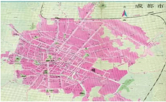 成都的城市格局尤其是街道的主要朝向,应该是受到特定自然大环境的制约,或者说,是根据成都平原“两山夹一带”独特地形以及空气流动方向而形成的。否则无法解释这种东西南北四门朝向,都是向东偏向约30度。有说法是这有利于大气污染物 的顺风稀释扩散 ,从而有益于城市的大气环境清洁。宋代两次出任成都最高首长的赵忭,在其《成都古今集记》早说得很清楚,成都的街道朝向和格局,是“顺江山之形”。如下图: