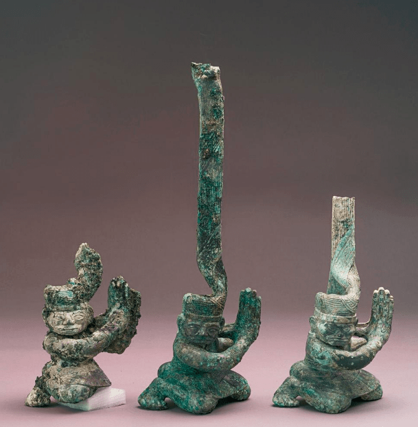 在三星堆遗址4号祭祀坑中,发现姿势奇特的青铜人像——3件铜扭头跪坐人像。这些人像呈跪坐姿态,双手合十,头扭向右侧,头上连接了一个长条形铜器。考古人员推测3件人像可能为成套组合器物。