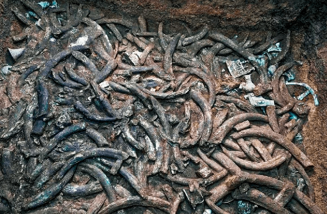 三星堆遗址8号祭祀坑器物出土情形(四川省文物考古研究院三星堆研究院 供图,余嘉 摄)