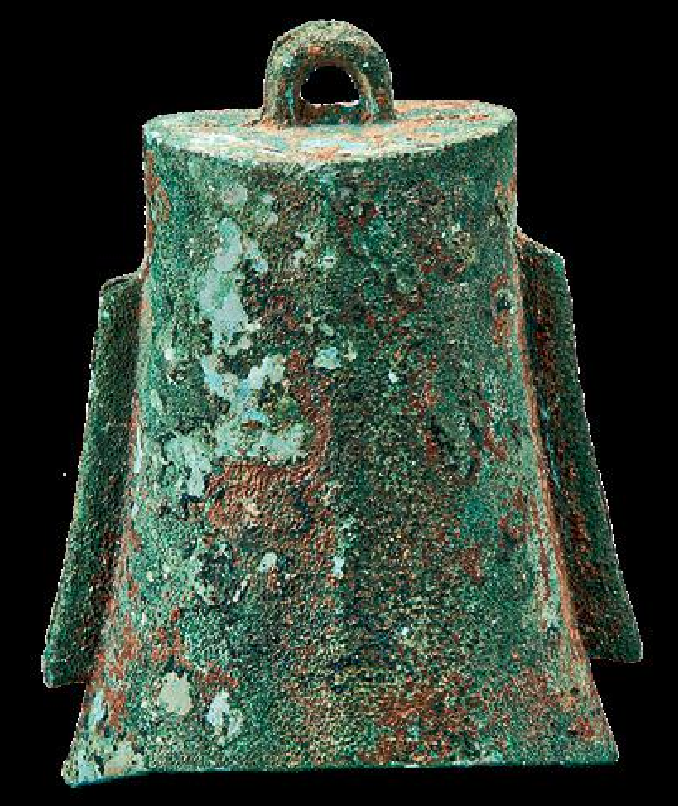 8号祭祀坑还有一件形似喇叭的铜器在泥土中露头。它的边缘穿孔,中间有朱砂填涂,旁边还发现一件铜铃。考古发掘人员推测,这件形似喇叭的器物,或许是一只铜鼓。之前,8号祭祀坑还曾出土了几块石板,专家们惊讶地发现,它或许是一件石磬。从各种乐器的出土,可以想象3000年前,三星堆奏响礼乐的盛大场面。
