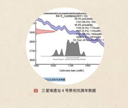 三星堆遗址1、2号祭祀坑采集的19个标本采用碳14测年,得出1、2号祭祀坑年代范围在公元前2471年至公元前1260年,不会晚于公元前1260年。三星堆遗址新发现6个祭祀坑中采集的73份炭屑样品,采用精确度、灵敏度更高的加速器质谱碳14测年法进行分析。其中,4号祭祀坑年代最有可能在公元前1199年至公元前1017年,年代区间属于商代晚期。