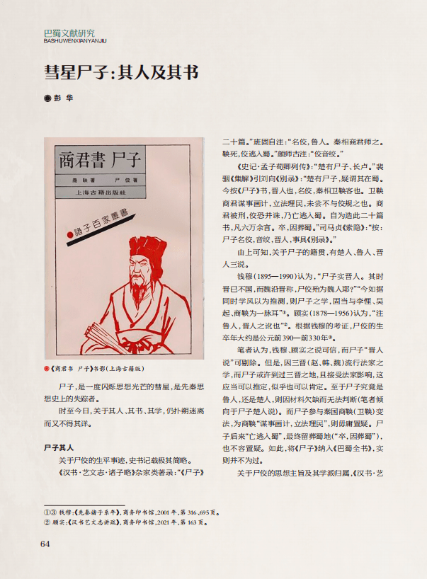 笔者认为,钱穆、顾实之说可信,而尸子“晋人说”可剔除。但是,因三晋(赵、韩、魏)流行法家之学,而尸子或许到过三晋之地,且接受法家影响,这应当可以推定,似乎也可以肯定。至于尸子究竟是鲁人,还是楚人,则因材料欠缺而无法判断(笔者倾向于尸子楚人说)。而尸子参与秦国商鞅(卫鞅)变法,为商鞅“谋事画计,立法理民”,则毋庸置疑。尸子后来“亡逃入蜀”,最终留葬蜀地(“卒,因葬蜀”),也不容置疑。如此,将《尸子》纳入《巴蜀全书》,实则并不为过。