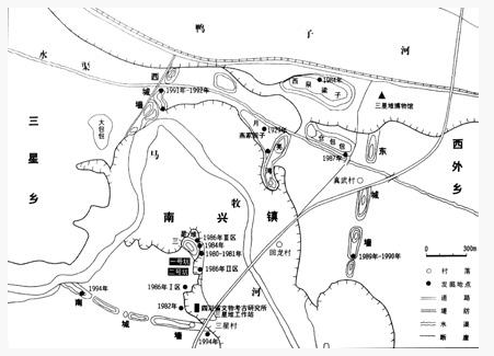 1985年春,陈德安率考古队,根据西泉坎与半个土堆旁侧等几个小范围内的出土情况,对周边地区做全面调查。从连年发掘出土的大量石器、陶器以及当地百姓捡拾的出土文物来看,整个遗址的分布范围十分广泛。经过反复调查确认,在这一大的区域内,除著名的月亮湾、三星堆以外,在周边相邻的回龙村、仁胜村、大埝村所属的田间耕地内,随处都可发现与以上两个遗址相同的残陶片与文化层,从而进一步确定这是一处由数十个小型遗址连接在一起的大型古遗址群,整个范围可达12平方公里以上。根据遗址的地形、地貌与文化内涵,考古人员首次提出这里曾经存在过一个“三星堆古城”的设想。按照这个设想,遗址的东、南、西三面各有城墙护卫,北边是江水浩荡的鸭子河(雁江),要么北城墙已被河水冲掉,要么原本就是以河代墙。发源于岷山河谷的湍急河流充当了这座古城的天然屏障,与其他三面土墙共同形成对古城内部的拱卫态势。从地层关系和出土器物的文化分期综合推断,这座古城的建造年代应为商代早期。鉴于这一考古成果的重要意义,同时为更好地保护三星堆遗址,在中央与四川省两级文物考古部门的斡旋呼吁下,广汉县委、县政府于1986年底提出一个折中方案,希望通过一次大规模的发掘,正式确定三星堆遗址的范围和价值,以便当地政府视情况做出最后的抉择。