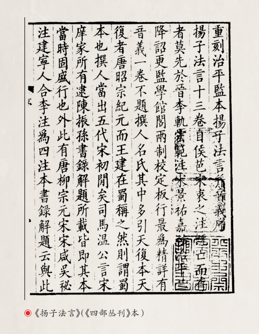 《法言》的最早著录见于《汉书·艺文志》诸子略儒家类:“扬雄所序三十八篇。《太玄》十九,《法言》十三,《乐》四,《箴》二。”《隋书·经籍志》以下历代书目等皆有著录。历史上《法言》的版本主要有两个系统:13卷本和10卷本。13卷本以李轨注《扬子法言》为代表,篇名依次为《学行》《吾子》《修身》《问道》《问神》《问明》《寡见》《五百》《先知》《重黎》《渊骞》《君子》《孝至》。历来校释和刊行的《法言》大多根据扬雄《自序》,以1篇为1卷,共13卷。此系统特点有二:一是十三小序在书后,二是序后附《法言音义》1卷。这一系统的版本尚存宋本:北宋治平二年(1065)国子监刻李轨注《扬子法言》本、清嘉庆二十四年(1819)秦氏石研斋影宋刻本。后世多以秦氏石研斋本为底本进行影印和刊刻。另一系统10卷本,始于北宋宋咸,合《吾子》《修身》为1卷,合《问明》《寡见》为1卷,合《五百》《先知》为1卷,共10卷,且将每篇小序放置卷首。10卷本系统有六:一是宋咸《扬子法言注》本,此本明清两代十分流行,重刊者有《汉魏丛书》本、《广汉魏丛书》本、《增订汉魏丛书》本、《丛书集成初编》本;二是司马光集注《扬子法言》本,原书已佚,今存明读书坊刊本、《四库全书》本;三是建宁四注本,北宋刊本,今佚;四是《纂图分门类题五臣注扬子法言》,宋绍兴间刘通判宅仰高堂刻;五是《新纂门目五臣音注扬子法言》,以建宁四注本为底本,增入温公《集注》;六是《纂图互注扬子法言》,南宋景定元年(1260)建阳书坊刊本,现藏于日本,为10卷本系统中最善,据傅增湘《藏园群书经眼录》,此版本还可分为南宋刊本、宋末刊本、明初刊本。