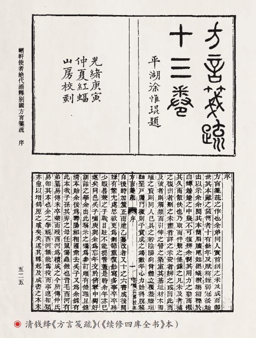 此书世有刊本,然文字古奥、训义深隐,校雠者猝不易详,故断烂讹脱,几不可读。清修《四库全书》,即据《永乐大典》所收,多有厘正。“参互考订,凡改正二百八十一字,删衍文十七字,补脱文二十七字……并逐条援引诸书,一一疏通证明,具列案语。”②今传本除《四库全书》本外,尚有《四部丛刊》本、《汉魏丛书》本、《景印元明善本丛书十种》本等。历史上为《方言》作注的有很多,亦不失为较好的《方言》版本选择。