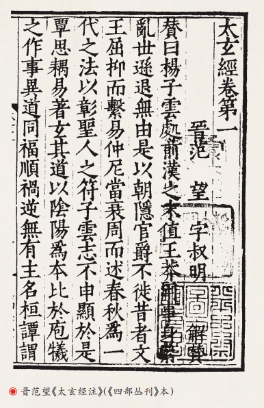 《太玄》为儒家早期拟经作之一,系依据汉代“浑天说”理论以及《太初历》成就,仿《周易》卦、爻、辞、象、变、占等原理而作。全书原本包括《玄经》《玄说》《章句》三部分,今本《章句》已佚,仅存经、传两部分。在数理方面,与《周易》“倍偶法”(即“太极生两仪,两仪生四象,四象生八卦”,八卦演为六十四卦)相对应的是,《太玄》蕴含“一分为三”“以三统众”的原理。其经文部分,以一二三为三方,四重之以为八十一首,形成一玄统三方、三方生九州、九州生二十七家、九九乘之以成八十一首的“太玄”学体系。其八十一首的次序,就首的符号而言,是按三进位制排列;就首的名义而言,则是按汉易卦气值日次序排列。其传文部分,共有《玄首》《玄冲》《玄错》《玄测》《玄摛》《玄莹》《玄数》《玄文》《玄掜》《玄图》《玄告》11篇,拟《易传》“十翼”以解经。其中《文》拟《文言》,《摛》《莹》《掜》《图》《告》拟《系辞》,《数》拟《说卦》,《冲》拟《序卦》,《错》拟《杂卦》。