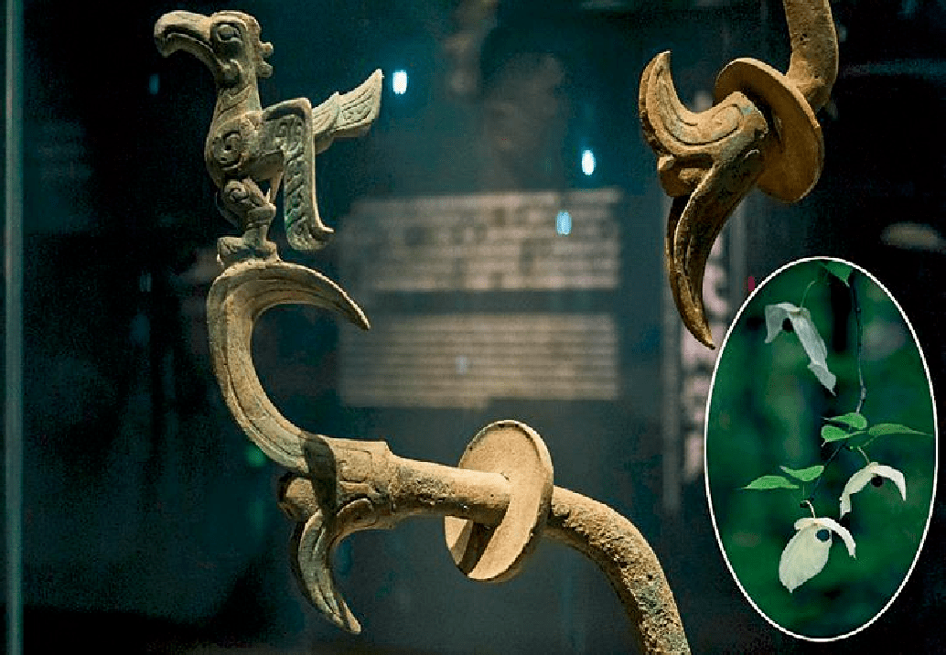 较多学者认为《山海经》里记载的神树若木就是青铜神树。《山海经》里对若木形态有明确的记载:“上有赤树,青叶,赤华,名曰若木。”若木为青色的叶子、红色的花。这不就是珙桐刚开花时的样子吗?如果若木指的就是珙桐花,那么古人此处称的“青叶”应指珙桐的花苞,今天科学称为叶子变态发育形成的苞片。我们不应低估古人观察自然的智慧,他们应是认识到它似叶非叶的特征,专门对苞片初长成时青色的色彩进行描述。因为自然界大多数植物的叶子都是青色,如不是指其似叶非叶的苞片,这里大可不必对叶子颜色进行描述。有学者认为青铜神树上那些造型仅是树叶和果实的形象,但如果是看过珙桐花之外形,应该再不会那样认为。除珙桐外,实难再找出外形和青铜神树那么高度相似的植物来,也实难想象古人铸造这么神圣且精致的器物,安放在上面的会是三两片平常的树叶而已。如若是花,那究竟还有哪种花是仅有两三片的花瓣,且一大一小,中间有个巨大的花蕾呢?