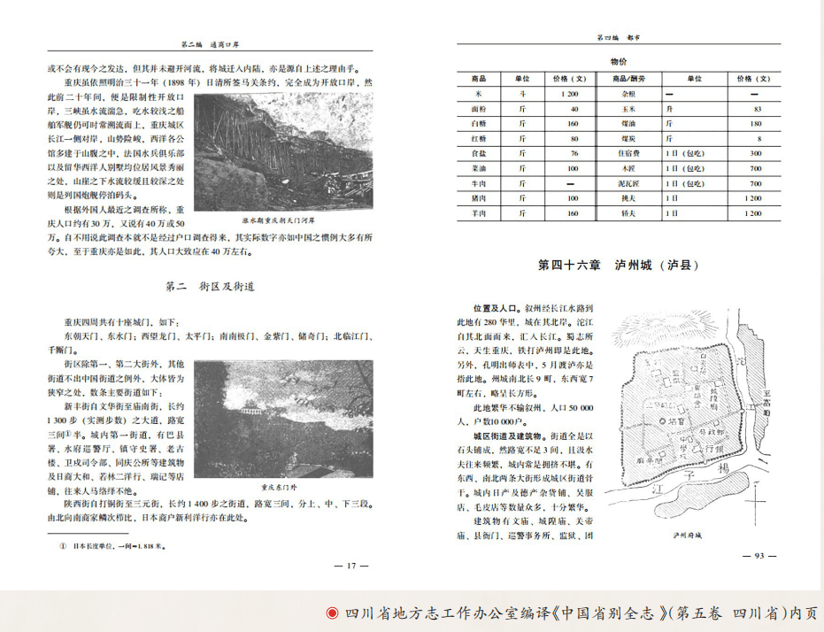 从宏观讲,《中国省别全志》重点记述商业和与商业相关的口岸、交通、通讯、物产、金融等内容,但四川卷对四川的政治、军事、教育、文化、卫生等未做记述,“自然”也仅在“总论”中记及气候。从微观讲,第三篇“贸易”只记述重庆、宜昌两地的贸易,就连列入第二篇“通商口岸”的万县的贸易情况也未记述。第四篇“都市”只记述50余个州县治地,其余都市未做记述。泸州,作为川南重镇,全志记述内容十分有限,仅在行政区划(记“领泸县、纳溪、合江、江安4县”)、都市、度量衡中有专门记述;其中“泸州城”设位置、人口、城区街道及建筑物、物产、交通、饮用水等目记述,是记述最详细部分,有1000余字。而同样记述“都市”,打箭炉(康定)则设专章5节记述,有图有表,近万字。另外,“度量衡”中泸州记有100余字,水运、邮政、物产地中点名提到。叙永厅在“金融机构”中单列一章,但字数不多。合江县更无具体内容记述。记述极不平衡,挂一漏万。