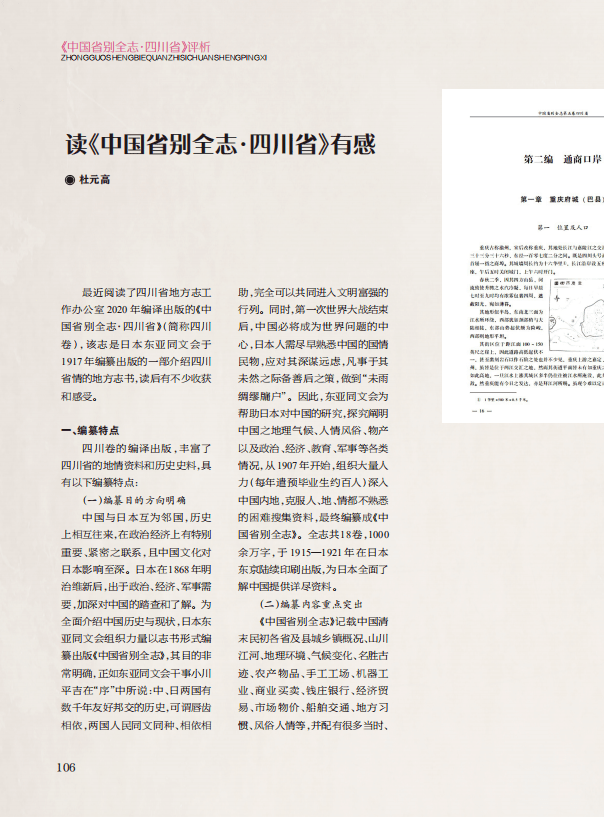 最近阅读了四川省地方志工作办公室2020年编译出版的《中国省别全志·四川省》(简称四川卷),该志是日本东亚同文会于1917年编纂出版的一部介绍四川省情的地方志书,读后有不少收获和感受。