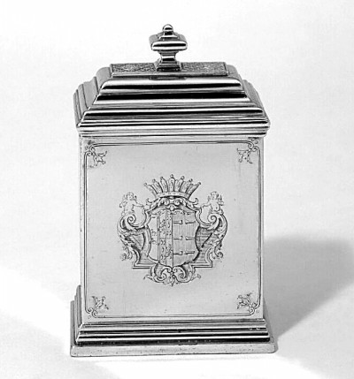 荷加斯雕刻纹章图案的茶叶盒 资料图片