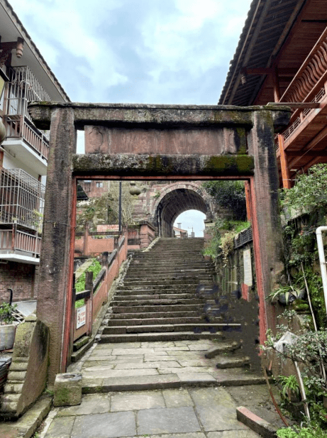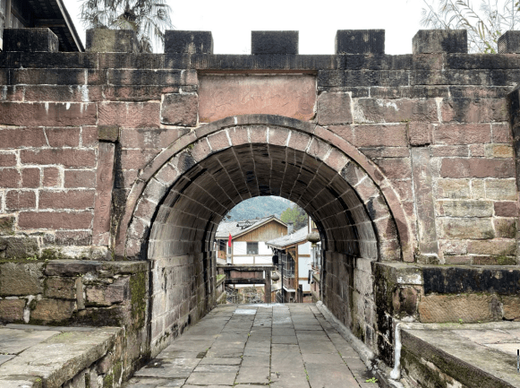 飞仙关关城、北城门、芦山县南界牌坊和仍在使用的一段茶马古道,隐于螺峰离堆下关民居街道。目测古道全长约4000米,宽约4米,由长宽不等的石板铺就,石板上仍可见拐子窝和路边被马绳打磨得光滑异常的“拴马石”。古道上竖立着建于明万历十六年(1588年)南北向石牌坊,牌坊高3.8米,宽3.3米,采用当地红砂岩跨道而建,双柱单门式,榫卯结构,顶横石匾两面均刻“芦山县南界”,风格质朴瘦劲。仔细看,南面东侧石柱右上角刻有“边、徼、茶”3个小字,两侧石柱还刻有两幅红军标语“争取赤化全川首先胜利!”“彻底消灭蒋介石!”石牌坊后,踏石阶而上就是当地红砂岩砌的飞仙关关城。可惜,关城虽在,但北城门和城楼已毁,仅存关城和北城门洞。城门洞上芦山县令范涞清所题“飞仙关”石门楣,石楹联:“客羽已乘黄鹤去=仙楼尚在白云间”“人宜来羽岛=地即是瀛洲”字迹清晰可辨,书法规整庄重。