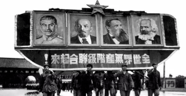 1950年“五一”劳动节,首都北京各行各业组成的方队参加了庆祝活动。图为游行队伍的前列,高举世界伟大革命导师马克思、恩格斯、列宁、斯大林巨像前进