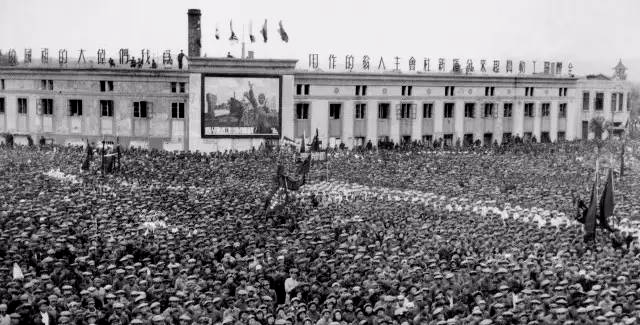 1950年5月,辽宁抚顺工人阶级与各界人民群众70000余人,在纪念“五一”国际劳动节、“五四”青年节大会上,表示做好工作、安全生产