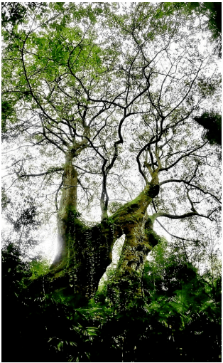 在圣灯山,有一棵千年暖木。笔者在当地人指引下,在盘山路上前行数公里,再沿一条泥泞的小路前行大约一公里,在郁郁葱葱的杉木林中,见到一丛较高的树冠。拔开挡住道路的杂树,只见一棵高大的古树屹立在林间。