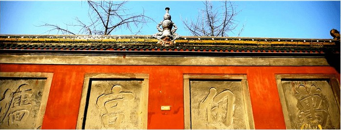 一、万仞宫墙:墙高七尺,墙垣宏伟,饰紫青色,刻有“万仞宫墙”四字,字体雄健苍劲,字大见方一公尺半。
