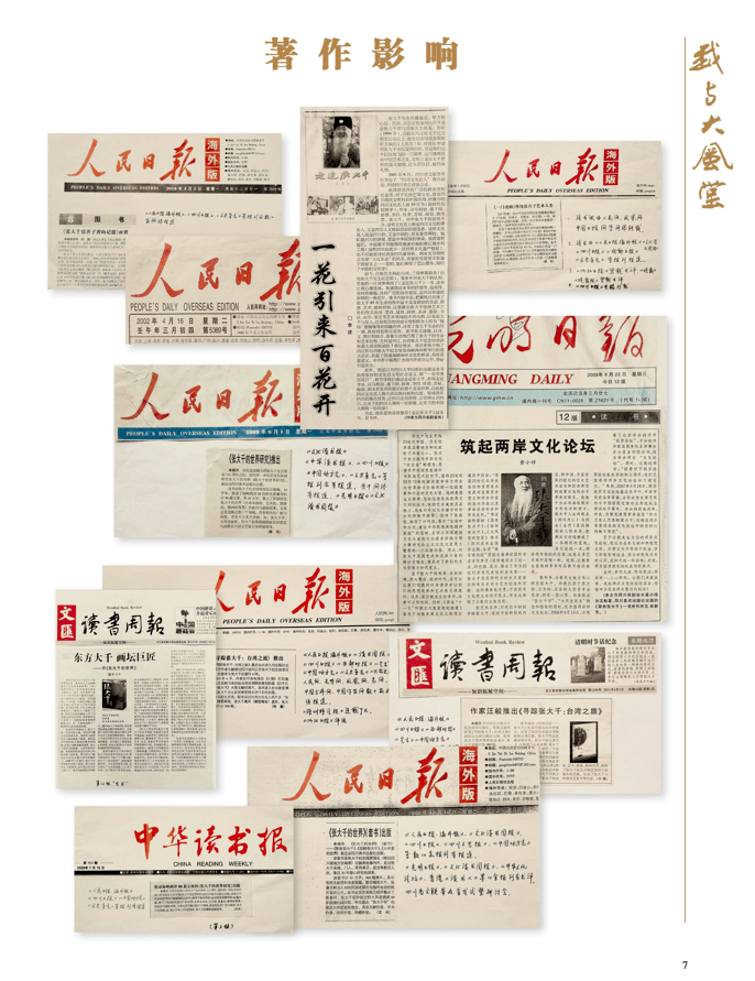 推动方面,一是发起并助推张善子墓的维修(已维修)、其纪念馆的建设,甚至建议国家民政部将张善子列入全国第二批著名抗日英烈(曾纳入第一轮遴选名单,详见《张善子的世界》一书,九州出版社,2015年)。二是拟编辑《张大千全集》,并协调了两岸三地(大陆、台湾、香港)诸关系(遗憾,功亏一篑)。三是于2011年5月,在第七届两岸经贸文化论坛中,建议比照“《富春山居图》联展”两岸举办“张大千临摹敦煌壁画珠联展”,得到时任国务院台湾事务办公室主任王毅、四川省人民政府主要领导和分管领导的批示以及台北故宫博物院院长周功鑫的具体意见(详见本书《两岸举办“张大千临摹敦煌壁画珠联展”的思考》一文),遗憾因故搁浅。四是出任中央电视台大型文献片《百年巨匠——张大千》文史顾问,协调在台湾的全部采访,促使中央电视台首次进入台北故宫博物院拍摄并采访周功鑫院长(详见《寻踪张大千:台湾之旅》一书,九州出版社,2011年)。