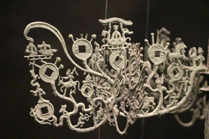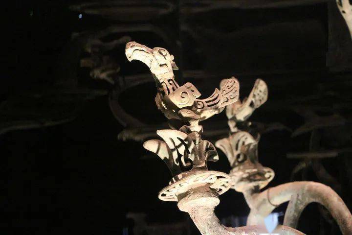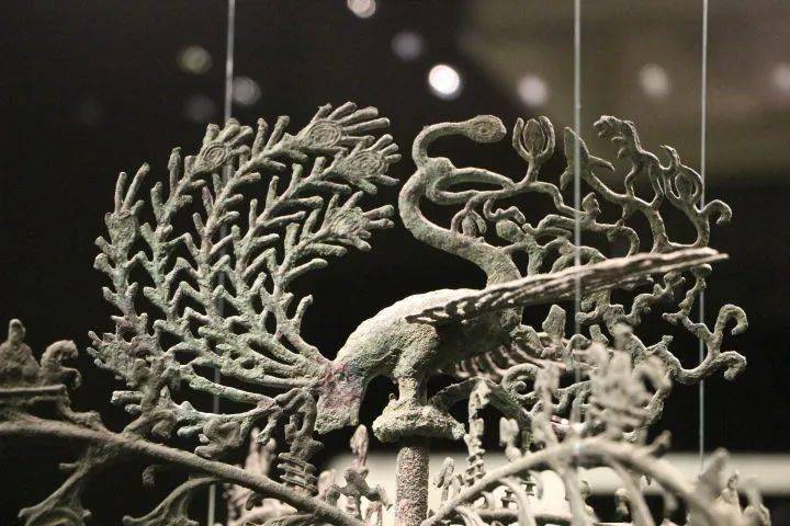 这是很震撼的奇物,其来源和功用争论很大。我们分析,神树造型灵感来自喜欢阳光的花椒树,在古代花椒是神物,用于祭祀和辟邪,还有多子和多福之意,其特殊的香味让人不可捉摸,久久不忘。神树上九只鸟,来自后羿射掉的9个太阳,太阳对古人有害,不受欢迎。九只鸟也是九头鸟,神树是九头鸟(或者九凤)的另外一种展示。帝喾的妻子既生月亮也生太阳。《山海经 ·大荒南经》【6、7】有“羲和者,帝俊之妻生十日”。《山海经 ·海外东经》“汤谷上有扶桑,十日所浴,在黑齿北,居水中,有大木,九日居下枝,一日居上枝。”居上枝的太阳就是现在的太阳。同时还说,“汤谷上有扶木,一日方至,一日方出,皆载于乌”。古人把太阳黑子当成了乌鸦。这便是鸟(乌)与日的关系,说明神树是征服太阳的纪念和丰碑,并无通天之意。