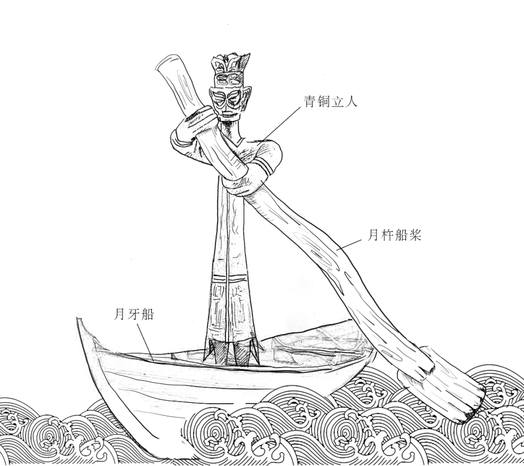 此物应是古蜀王鱼凫造型,帽子、眼睛、耳朵、衣服、底座等都可见月亮符号,因此是祭月主持人。那双铸造成环状的大手,一高一低放在胸前,每只手都握成圆环状,给人的感觉是抓着某种东西的,而且抓握的东西应该是圆柱形的物体。奇怪的是,站立人两只手握成的圆环形状并不同心,也就是说其圆心轴并不重合,也不相交,所以这只青铜大立人手中到底拿的是什么?这个问题成了一个考古难题。有的说握的是象牙,有的说握的是蟒蛇,有的说握的是两样东西。我们分析,在古蜀时代,鱼凫王有多种身份,比如国王、渔夫,还有祭月的主持人(巫师)。在主持祭月仪式时,他手中是“月亮五更轮盘”,敬拜月亮;在做政教合一的国王时,他手中是金杖(柔软的、有包装物),指挥广大民众;在捕捞江河野鱼时,他手中是月杵船桨,划的是月牙船。