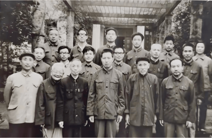 1982年6月南充师范学院中文系中国古代文学专业首届研究生毕业合影(前排左起:郑临川先生、傅平骧先生、周虚白先生、罗兴波院长、周子云先生、邓学界副院长)