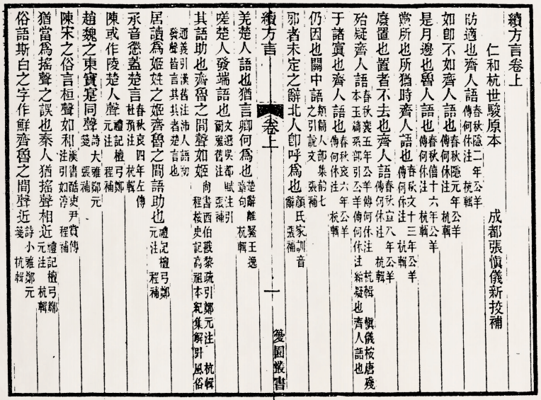 《续方言新校补》凡2卷,卷首有清光绪三十一年(1905)赵藩《序》及《略例》,末附李子荣《跋》、王树枏《续方言拾遗原序》及《四库全书》本《续方言》提要。卷中依杭世骏《续方言》原次,先录杭氏校辑,次录程氏《补正》,再录张氏自己所补。仿程氏《补正》体例,将见于他书而与本条文字有异者,系于本条之下。杭氏原辑所引各书于原书文字有讹脱者,悉据原引各书原文备录于下,随条予以校正。故张氏自谓“是正杭、程书者十之七八,芟补者十之四五”,远较二家原书详审。且一编之中,校、补兼详,颇足以补其所遗、正其所误。其合杭氏、程氏所辑与自己所补为一,亦尤便于征考。