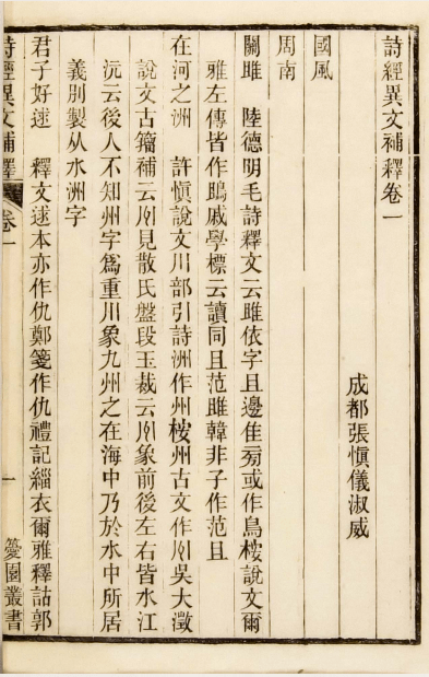 张氏《诗经异文补释》,书凡16卷,乃承李富孙、冯登府等人研究成果,并参稽博引清中叶以来诸家之说而综合考证《诗经》异文的一部专著。《自序》述其撰作大旨:“读经必先考异,经字异同之辨明,而后解说之是非定。不然通假不知,谬误不问,但据今本望文生训,则是鹪朋已翔于寥廓,罗者犹视乎薮泽矣。深宁(王应麟)更有《诗考》之作,惜老艸成编,未为善本。继之者,王衡阳(王夫之)、范会稽(范家相)、冯嘉兴(冯登府)、陈侯官(陈寿祺、陈乔枞)为最善,虽各有胜处,而体例仍未悉。当予客居之暇,重温《三百篇》,乃荟诸书,钩考审定,以资讽诵,亦困勉为之也。”