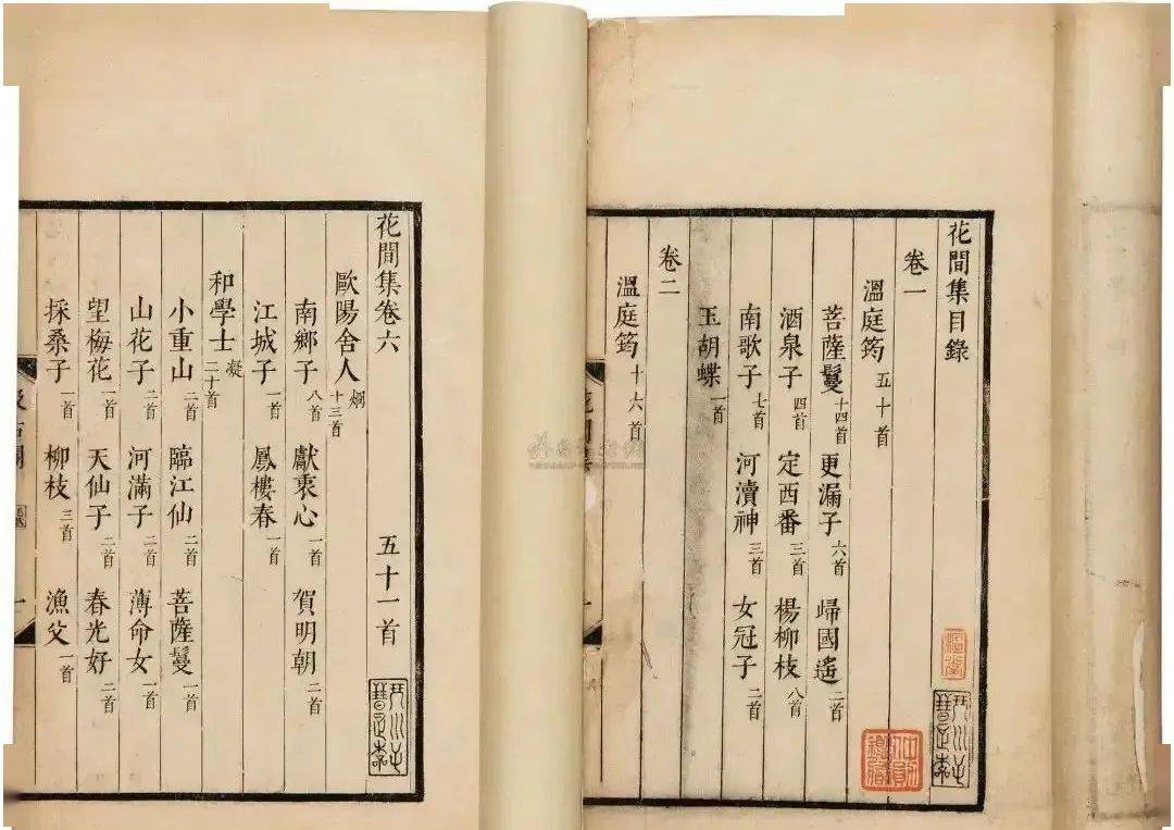 《花间集》集中而典型地反映了我国早期词史上文人词创作的审美取向、情趣风格和艺术成就,真实地体现了早期词由民间状态向文人创作转换、发展之过程的全貌。规范了词的文学体裁和美学特征。花间词还为后世贡献了“诉衷情”“玉楼春”等词牌名。温庭筠取《离骚》“众不可户说兮,孰云察余之中情”之意,创制“诉衷情”。而“玉楼春”则来自顾敻的“月照玉楼春漏促”“柳映玉楼春欲晚”。