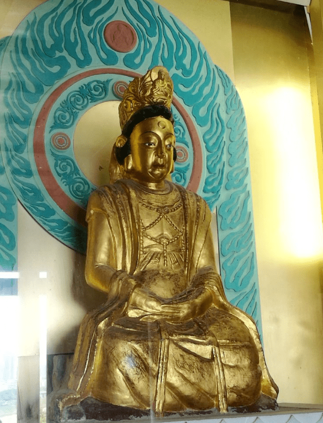 沿着皇泽寺的中轴线拾级而上,就是则天殿,殿正中供奉着一尊唐代雕刻的武后真容石刻像,置于花边莲花宝座之上,石像方额广颐,神态安详,头戴佛门宝冠,身着僧尼衣袍,肩披素帛,双手相叠于膝,做法界禅定印。据记载,武后真容石刻像雕刻于武则天登基之后,由于武则天63岁登基,故此像面部肌肉松弛,眼袋突出,身材微微发福,是晚年武则天的写真。