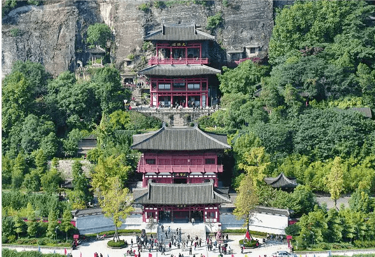 穿过绿荫小道拾级而上,便是郭沫若手书的石碑:“广元皇泽寺”。俯视崖下,江水奔流;回首寺内,曲径通幽、花木繁茂,香火终年不断、游人络绎不绝。寺内的二圣殿、武氏家庙、大佛楼、写心经洞、五佛亭、吕祖阁倚岩屹立、错落有致,实乃一幅绮旎的巴蜀胜景图。