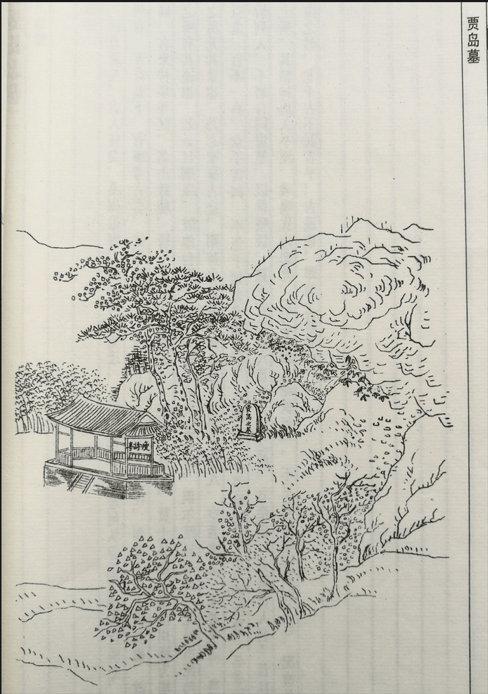 贾岛墓、瘦诗亭(载清乾隆本《安岳县志·古迹》)。亭为安岳古迹图景首列。志书中,录有贾岛诗和后世凭吊诗若干