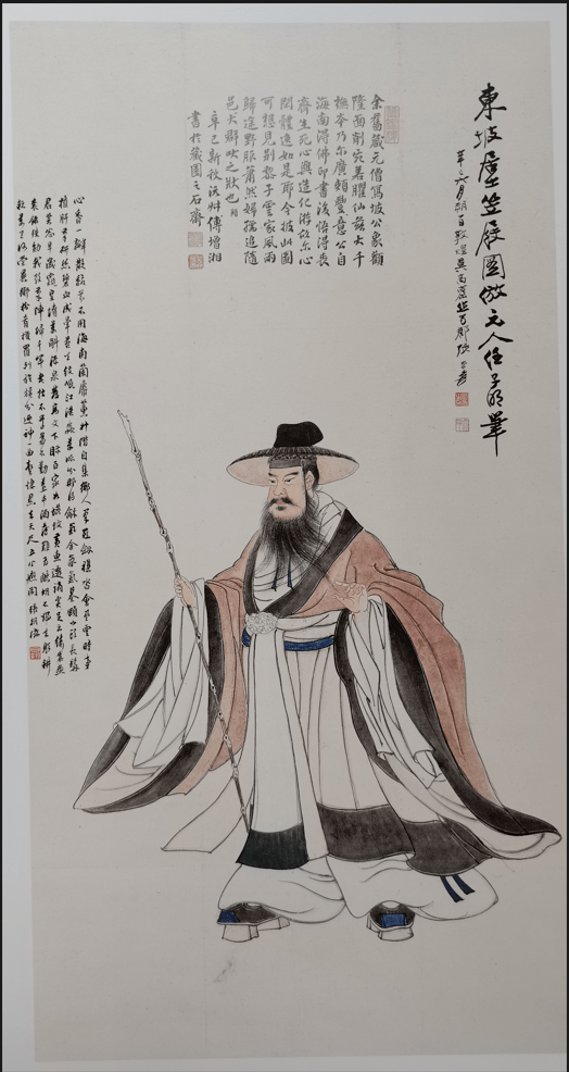 张大千诗画苏轼,与其说是对苏轼诗的钟爱,不如说是他对苏轼人境的一种向往和追求。故可以说,张大千对苏轼的追随已达到无以复加的地步,即无论是在追求的形还是在神方面,均体现了高度的文化圆融和精神契合。对此,傅增湘曾题诗:“笠屐风流谁写出,眉公而后属张髯”,以赞张大千乃苏轼千年后的知己。的确,苏轼与张大千一古一今,堪称“震古烁今两东坡”。总之,对其个体比较研究不乏趣意和典型意义,颇能体现时代文明的精髓,甚至可以结构出新的文化范式,创意出新的文化品牌,整合放大中华文化效应。
