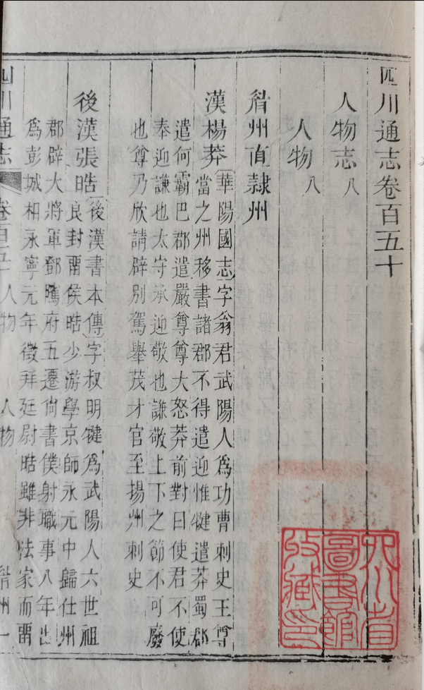 清嘉庆《四川通志》于1861年成书刊行,计226卷,388万字,体量堪称四川古代所修总(通)志的航母。除卷首“圣训”外,内容囊括了天文志、舆地志、食货志、武备志、职官志、选举志、人物志、经籍志、纪事志、西域志、杂类志等十一种门类,而人物志只占其中类别的十一分之一。人物志记述的对象为忠节、孝友、隐逸、行谊、流寓、艺术、先释、烈女、淑女、义烈、贞孝、杂传等十二个方面。从中可见,该人物志在类别、收录标准、篇目设置等方面的构成,以及由此而具有的时代局限性。其中有的内容,虽然今天看来定位有局限,但在表现形式上却可以作比较研究,如体例、篇目设置、记述方法等。