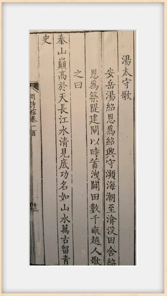 《汤太守歌》,载《明诗综》,朱彝尊辑录:泰山巅,高于天;长江水,清见底。功名如山水,万古留青史