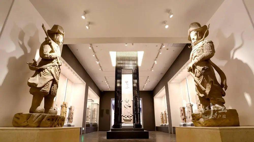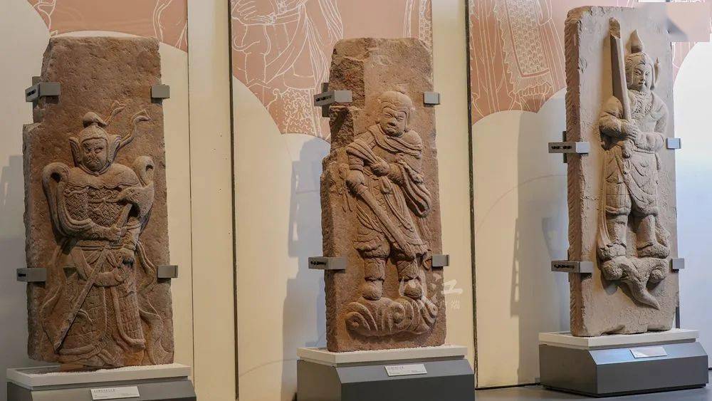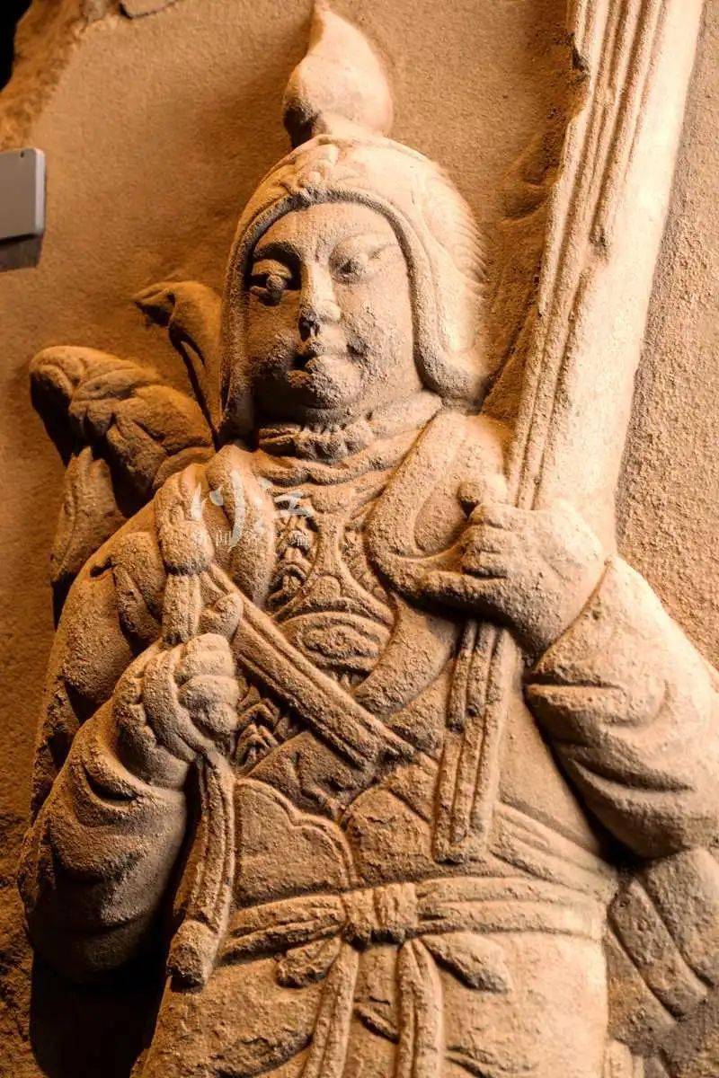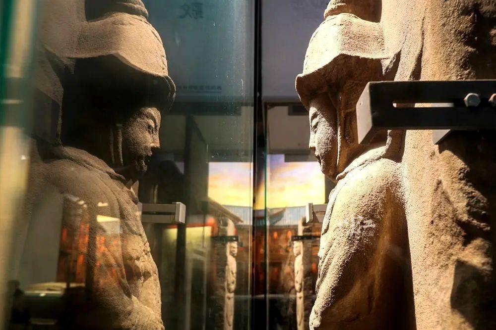 “像不像门神?”罗玉兰指指馆中的一组相互呼应的武士石刻。一经提醒,越看越像,这组武士石刻造型、神态竟极似中国古代社会民俗文化中的门神。披甲执锐的护门神将是驱邪避鬼、镇家宅、保平安、护卫门内之人,是古人“事死如生”观念在墓葬中的客观反映。