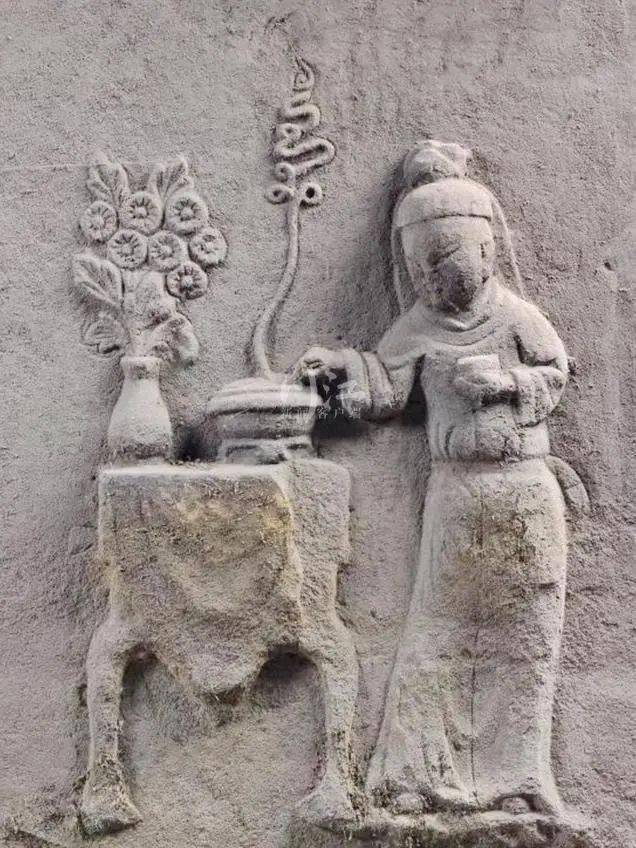 另一件石刻正中浮雕一张四角矮方桌,桌上左置瓶花,右放香炉。桌旁男侍左手拿香盒,右手拈香入炉,时间仿佛停止在他正准备将香料投入香炉的一刹那。