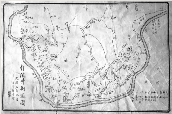 对于自流井的位置、城区街道及建筑物等情况,日本人是这样记载的:“自流井位于距离富顺县95华里处,距离嘉定360华里,距离隆昌县180华里处。”“城区为一条长12—13町(约1.3—1.4千米)之街道,街宽3间(约5.5米),最为繁华,吴服店、餐馆、戏楼、茶馆均是装饰华丽,其余普通店家之建筑亦造型华丽。”“主要建筑物有富顺县分县衙门、地方审判厅、国税征收所、团练局、步兵二营、邮政局、巡警所等。此外还有禹王庙、关帝庙、财神庙、火神庙、五福庙以及高等小学,有加拿大人3名,从事传教活动。”根据日本人的描述,自流井在当时的城区面貌与民国五年(1916)由国人单璋绘制的自流井街道图竟然高度吻合,可见他们在自流井的调查活动绝非走马观花。
