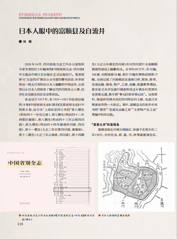 该志成于1917年,系1915—1921年陆续出版的18卷《中国省别全志》(原名《支那省别全志》)中的第五卷,由日本“上海东亚同文书院”第六期生(明治四十一年长江班)、第七期生(明治四十二年西鄂巴蜀班)、第八期生(明治四十三年云南四川班)、第九期生(明治四十四年湖南四川班、四川班)、第十一期生(大正二年甘肃四川班、秦蜀班)、第十二期生(大正三年云南班、四川班)、第十四期生(大正五年湖北四川班)在对四川进行全面踏勘调查的基础上编纂而成。全书约48万字,共10编、169章,另附地图36幅、照片72幅和事物说明图17幅,全面记载了川渝概况及通商口岸、贸易、都市、交通运输、邮电、物产、工商、金融、度量衡等情况,甚至连日本学生旅行调查所经过乡镇及村的资料也搜集无遗,真可谓“事无巨细尽皆记录”。这些资料,既是研究清末民初四川的史料文献,也是日本图谋侵华的一大铁证。其中,富顺县及自流井在该书的“都市”“交通及运输工具”“主要物产及工业”等编中均有记载。