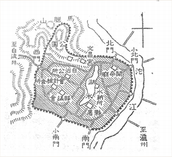 翻阅《中国省别全志·四川省》,发现日本人对富顺县城的位置环境、城区街道以及建筑物等有着非常详细的记载:“自泸州至此地陆路有180华里,需2日行程。自嘉定至此地陆路有450华里,需5日行程。城墙周长约为日本之1里半(约5.9千米),宽约1町(约109.1米)之沱江,沿城北、东、南三面流过。西北一带为高地,有称为玛瑙山之小丘。”“设有公园,依流经此地之沱江,上可溯至四川第一产盐地自流井,下可到达泸州。”“街道以石头铺成,虽宽3间乃至4间(约5.5—7.3米),但无东西南北相通之大街。城内街道颇为复杂,只有略绕城一周之街道最为繁华。商户皆是沿此街道分布。建筑物中,规模宏大者有文昌庙。官衙有县公署、巡警局、团练局、租税收纳所、县会议事堂、地方会计检查所等。学校有中学堂、小学堂等。福音堂亦有1座。”这些通过近代测绘、统计手段形成的文字材料,风格与历代富顺旧志迥然不同。透过这些材料,既显示出日本“上海东亚同文书院”学生超强的情报搜集能力,也能看出日本对中国大地昭然若揭的觊觎之心。