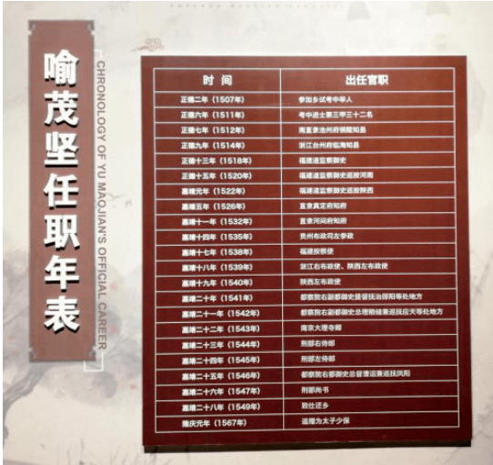 明嘉靖元年(1522),喻茂坚任陕西巡按,负责调查总兵李隆唆使军兵杀害巡抚许铭一案。他秉公执法,将大有背景的李总兵绳之以法,并上疏建议在这里复设总督一职。由于他的上疏涉及弹劾内阁大臣、各部长官,因此触怒权贵,被贬职迁官,但他的奏疏广为传颂,人称“中兴第一疏”。喻茂坚先后任真定知府、河间知府、贵州左参政、福建按察使、浙江右布政使和陕西左布政使,遍及半个中国。他严惩贪官污吏,平反冤假错案;保疆卫国,立下卓越功勋。嘉靖二十四年(1545),喻茂坚奉旨查办楚愍王被世子朱英耀刺杀一案。他以国为重、不徇私情,秉公处死世子朱英耀,受到明世宗赞赏,世称“汉廷老吏,当代法家”。