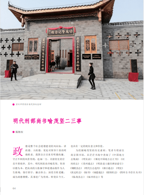 政德是整个社会道德建设的风向标,讲政德、立政德,更是对领导干部的明确要求。我国自古以来有明德尚廉、守正不阿的风骨传统,造福一方、名留青史的官员不胜枚举。其中,明代刑部尚书喻茂坚,坚持以德为本,把高尚的人格操守和道德品格作为人生准绳,恪尽职守,廉洁奉公,深受百姓爱戴,成为政德楷模,其事迹广为传颂,即使在今天,也具有一定的现实意义和价值。